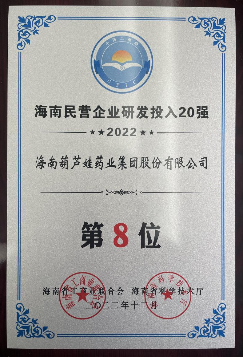 12月23日,2022海南民营企业50强和研发投入20强发布会在海口举行。会上发布了“2022海南民营企业50强”“2022海南民营企业研发投入20强”榜单和分析报告。PA视讯药业再次荣登两榜,在海南民营企业50强榜单中位列第25位,较去年上升8位,这也是公司连续三年登榜;在海南民营企业研发投入20强中位列第8位,较去年上升7位。